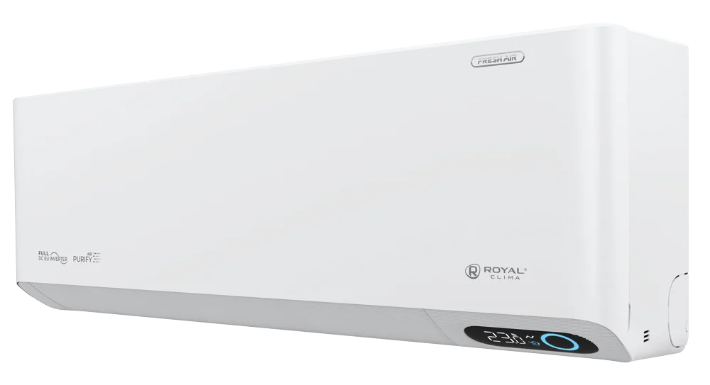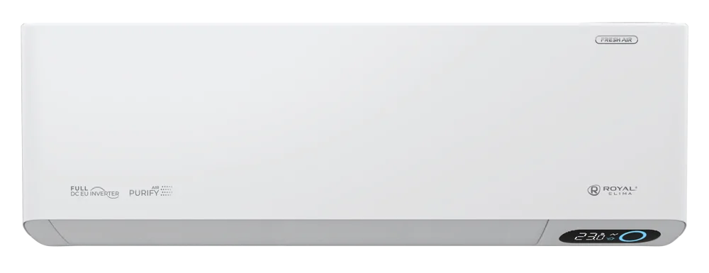 Сплит-системы с функцией притока и очистки свежего воздуха ROYAL FRESH STANDARD позволяют не только охлаждать и нагревать рециркулирующий в помещении воздух, но и насыщать пространство приточным воздухом с улицы, предварительно производя его очистку благодаря высокоэффективному HEPA фильтру. Он задерживает до 95% мельчайших частиц пыли, сажи, пыльцы, спор грибов и других загрязнений размером до 3 мкм.;Производительность устройства в режиме приточной вентиляции составляет 60 м<sup>3</sup>/ч.;Кондиционеры ROYAL FRESH STANDARD c низким уровнем шума внутреннего блока от 19,5 дБ(А), оснащены интеллектуальным датчиками освещенности, регулирующие подсветку дисплея. Высокоинформативный модуль индикации отображает режимы работы кондиционера, меняя цвет.;Эксклюзивный дизайн перфорированных вертикальных жалюзи позволяют равномерно разбивать воздушный поток, тем самым делая процесс охлаждения комфортным для пользователя. А функция равномерного распределения воздушного потока 3D AUTO AIR позволяет управлять горизонтальными и вертикальными жалюзи внутреннего блока с пульта управления. Отличная мощность с идеально распределенным мягким и объемным обдувом - забудьте о сквозняках, наслаждайтесь прохладой.;Управлять кондиционером удобно и приятно с помощью пульта ДУ эргономичной формы с большим информативным дисплеем и точностью установки температуры 0,5 °С, а также удаленно благодаря встроенному Wi-Fi модулю с использованием мобильного приложения SmartLife-SmartHome.;