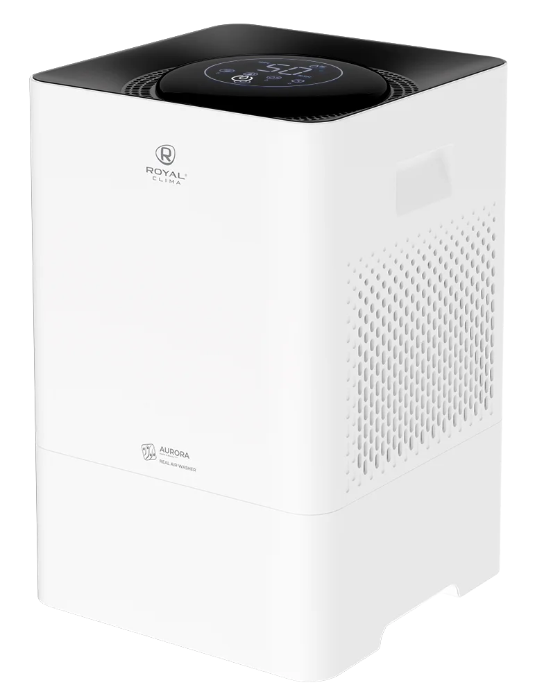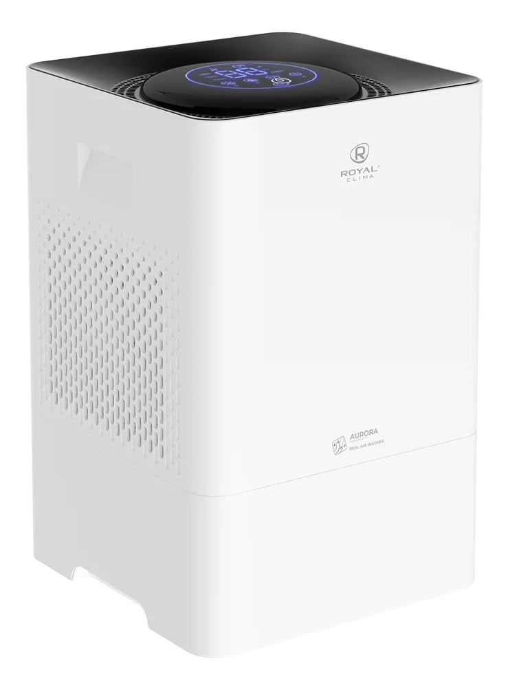 Мойка воздуха AURORA от ROYAL CLIMA быстро и эффективно увлажняет воздух в помещении. Wi-Fi управление с помощью приложения SmartLife даёт возможность установить расписание работы прибора и контролировать устройство удаленно.;У модели быстрый и удобный залив воды сверху без брызг и шума. При помощи гигростата можно установить желаемый уровень влажности в помещении от 40% до 90%. Электронная панель управления имеет 3 режима скорости выхода пара, таймер, индикацию относительной влажности воздуха в помещении. Функция "Теплый пар" для более эффективного увлажнения помещения.;