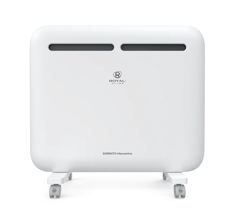 Модельный ряд электрических конвекторов ROYAL CLIMA пополнился новыми сериями: SORENTO Econo, SORENTO Meccanico и SORENTO Elettronico. Все серии представлены моделями мощностью 1, 1,5 и 2кВт.;Ключевыми преимуществами новых серий являются высокоэффективные нагревательные элементы X-ROYAL Long Life Heater в сериях SORENTO Elettronico и SORENTO Meccanico, а серии SORENTO Econo - экономичный и эффективный СТИЧ-нагревательный элемент, сделанный по технологии Fast Royal HEAT Technology. Специальная конструкция дополнительных излучателей гарантирует мгновенный разогрев до рабочей температуры.;Панель управления конвекторов расположена в верхней части, что обеспечивает удобство эксплуатации. В сериях предусмотрена двухуровневая система безопасности: автоматическое отключение прибора в случае его перегрева, а также низкая температура корпуса за счет технологических решений.;Температура передней панели не превышает 85 °C, что соответствует разрешенной температуре для бытовых помещений, в том числе детских комнат (по требованию ГОСТа). Высокий класс влагозащиты IP24 гарантирует безопасное использование прибора даже в ванной комнате. В комплект поставки уже входит все необходимое для установки прибора на стену, на ножки с мобильными колесиками или просто на ножки.;